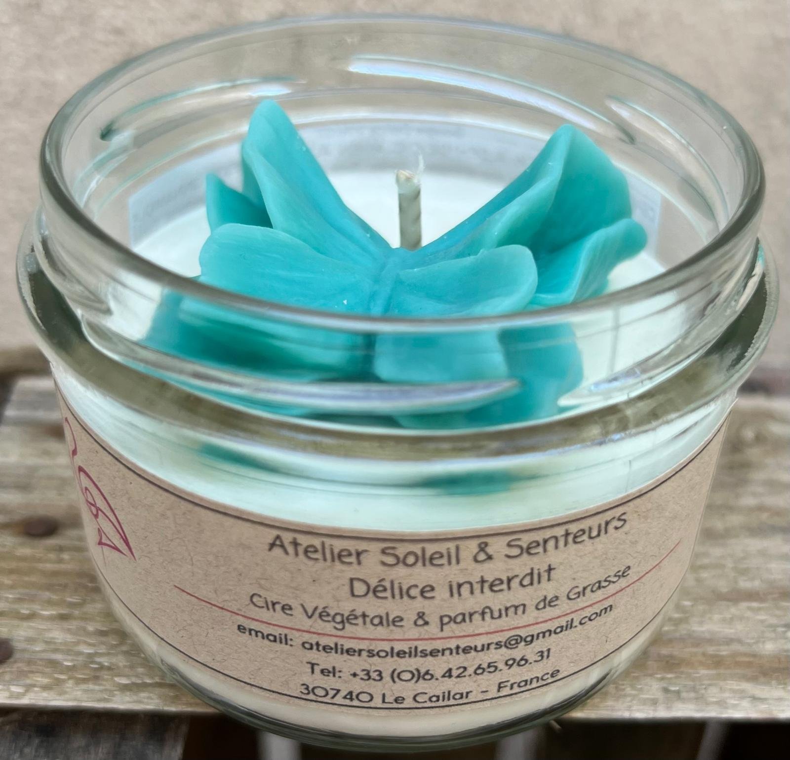 90% de cire végétale de soja, 10% de parfum de Grasse sans CMR (substances cancérigènes) – Parfum délice interdit (dominante poire), mèche en coton, colorants naturels et paillettes en cellulose d’eucalyptus.