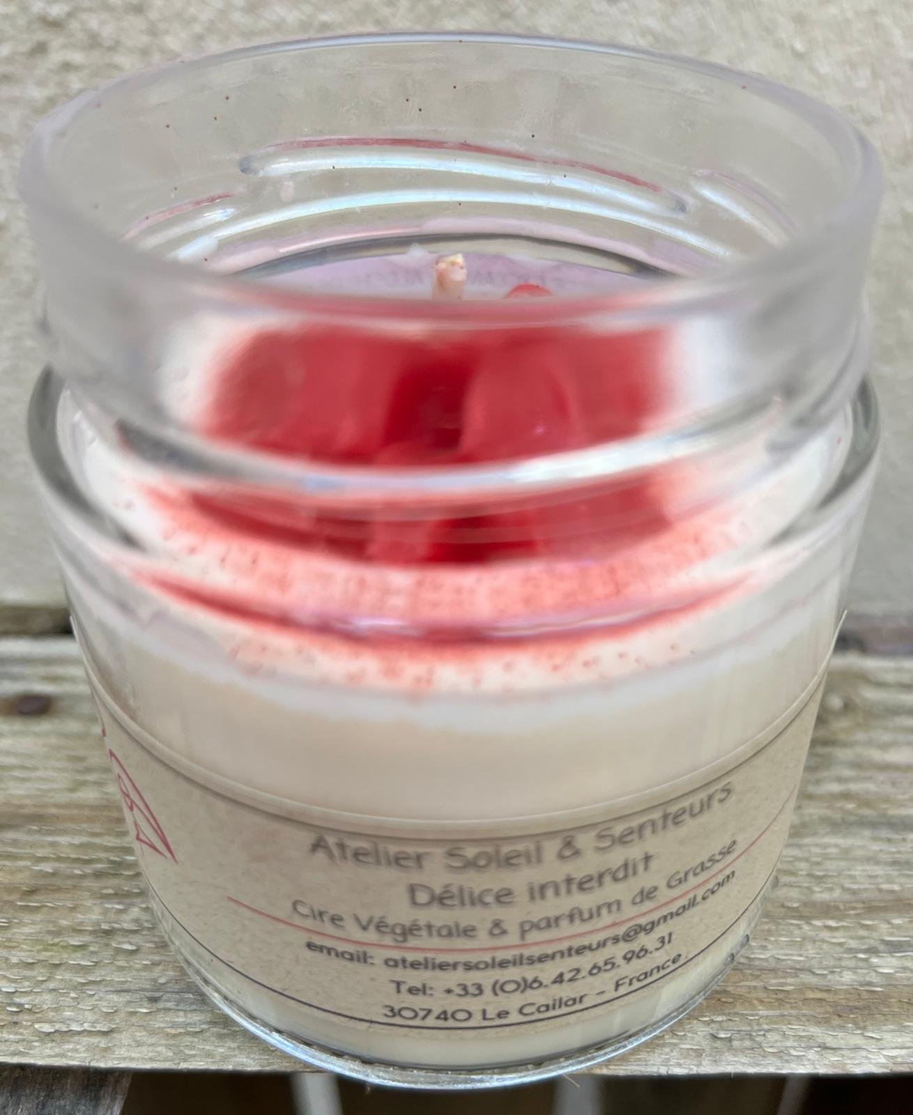 Bougie format M – Parfum délice interdit (dominante poire) – Couleur blanche & rouge – Pot en verre