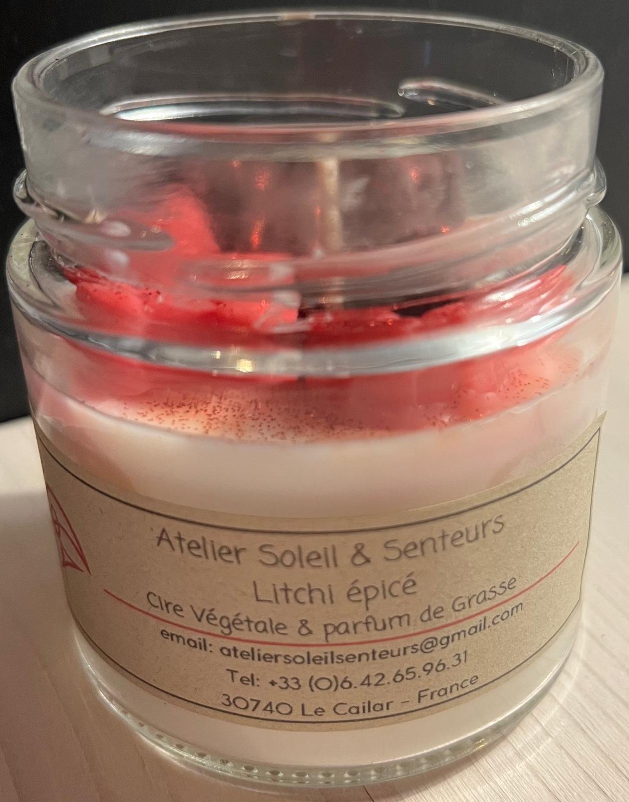 Bougie format M – Parfum litchi épicé – Couleur blanche, rouge & brune – Pot en verre