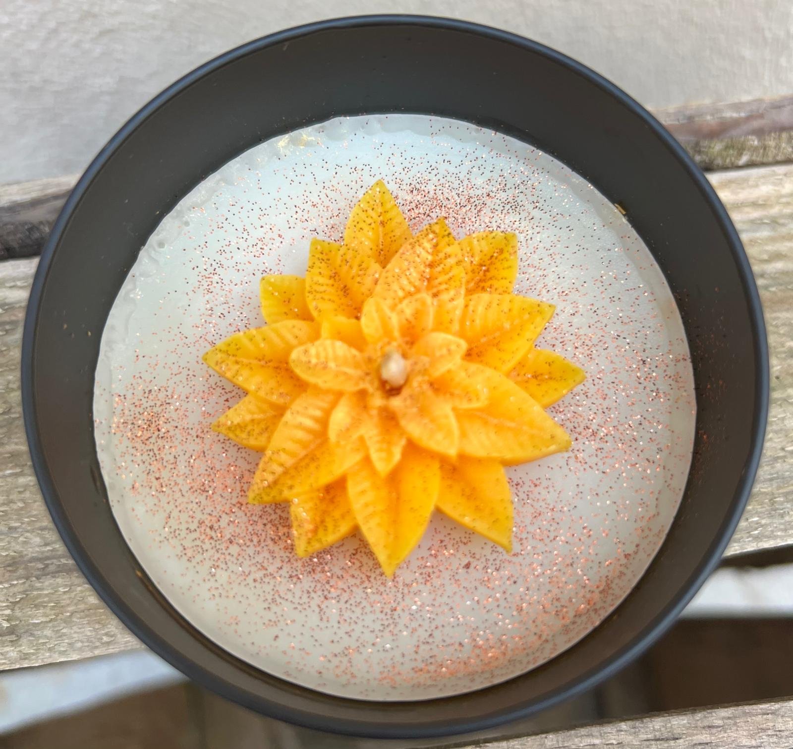 90% de cire végétale de soja, 10% de parfum de Grasse sans CMR (substances cancérigènes) – Parfum macaron vanillé, mèche en coton, colorants naturels et paillettes en cellulose d’eucalyptus.