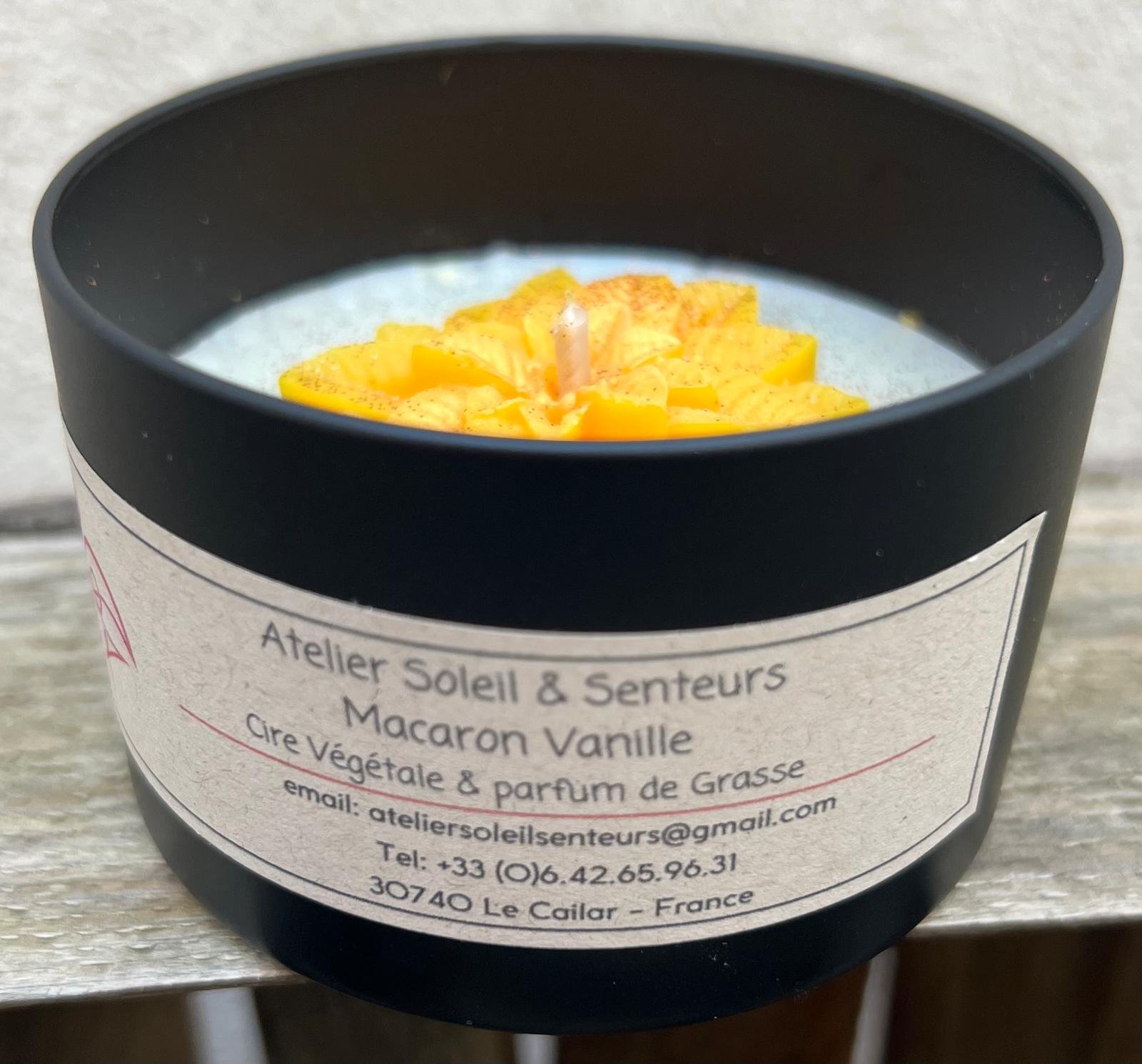 Bougie format M – Parfum macaron vanillé – Couleur blanche & jaune – Pot en fer noir