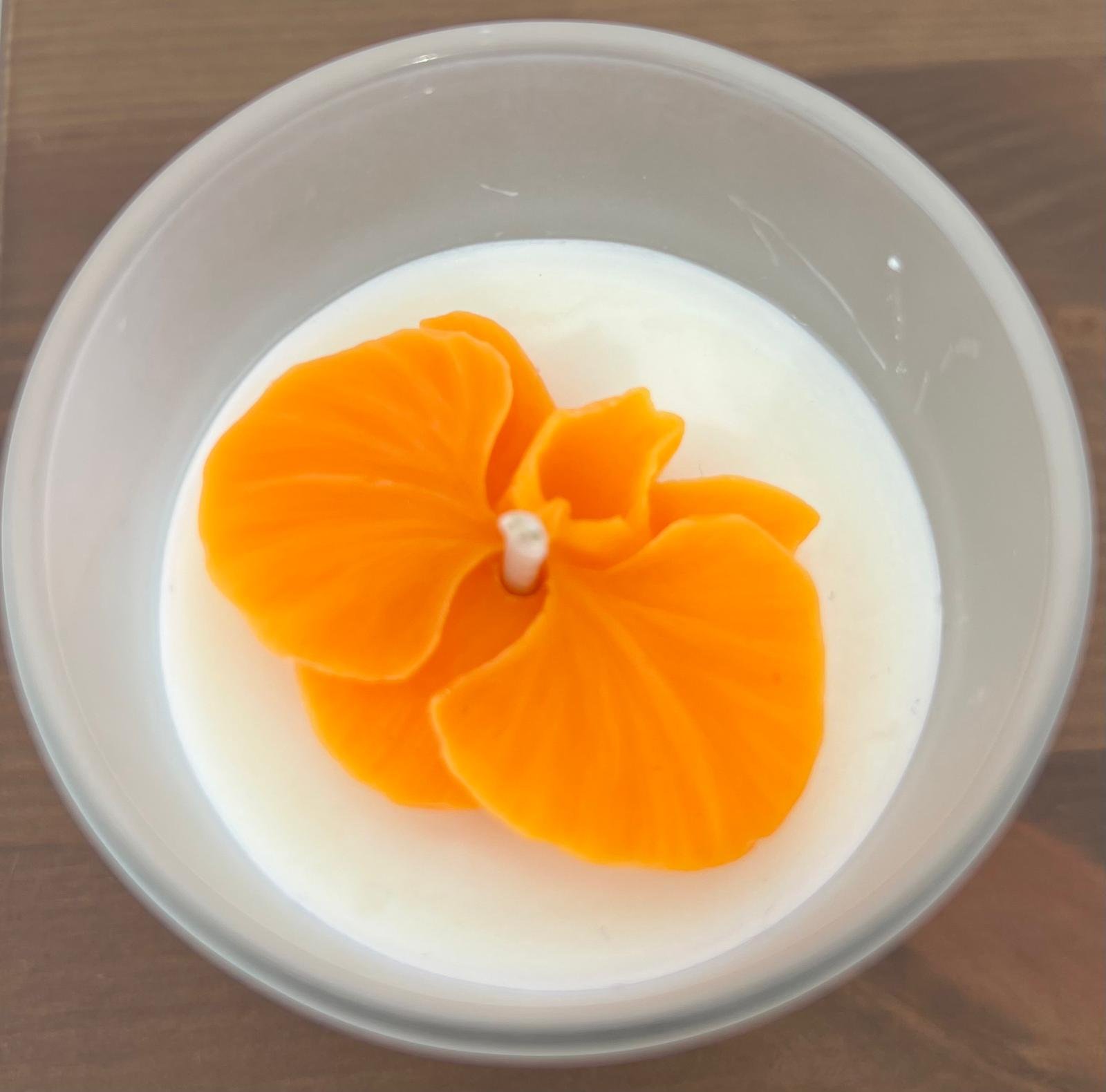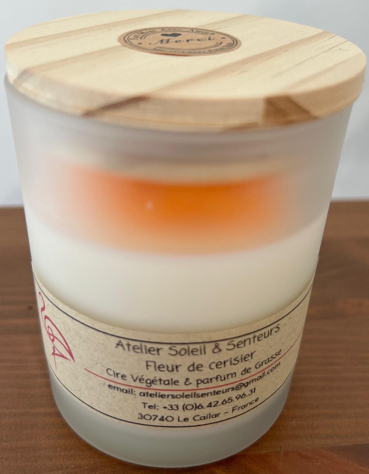Bougie M contenant verre transparent avec couvercle en bois. Poids env. 140g Motif couleur orange – Parfum fleur de cerisier Parfum, motif, couleur modifiable sur commande par email ateliersoleilsenteurs@gmail.com